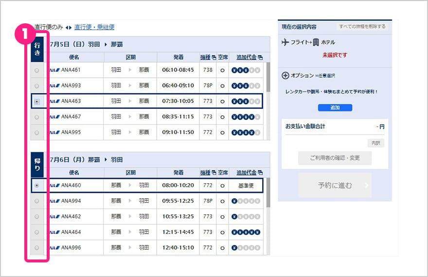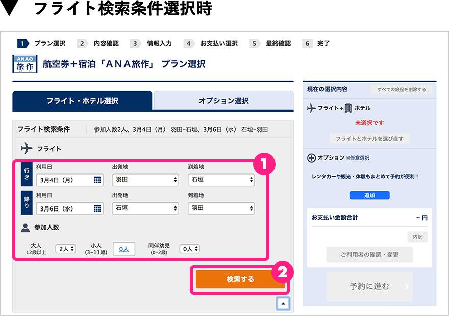 飛んだページ先で、❶エリアでフライト日程と出発地、