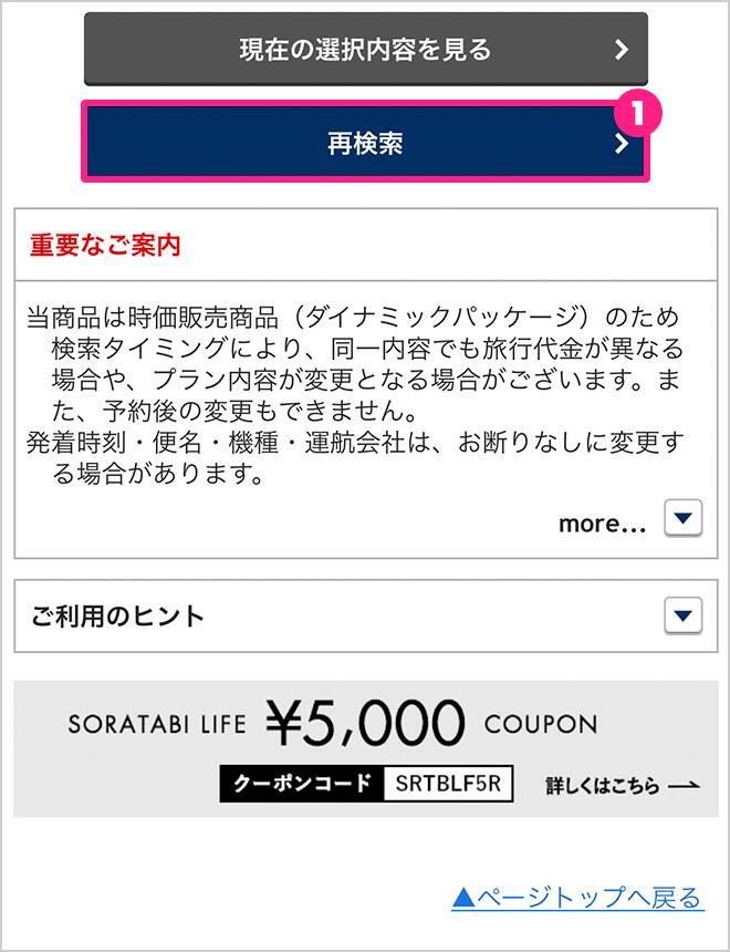 ※日程を変更する場合は、ページ最下部の「再検索」をクリック。