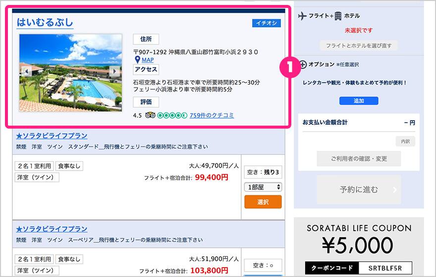 宿泊ホテルが決まったら、❷のエリアでお好みの