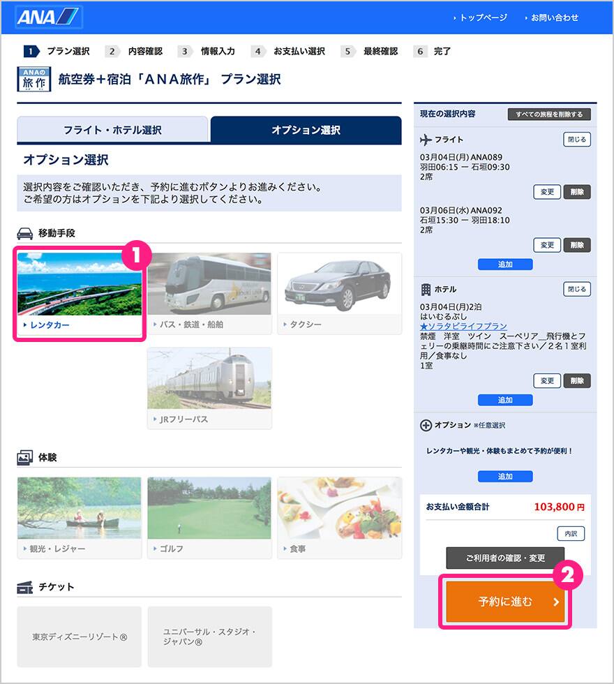 オプションを希望されない方は、❷の予約へ進むボタンを