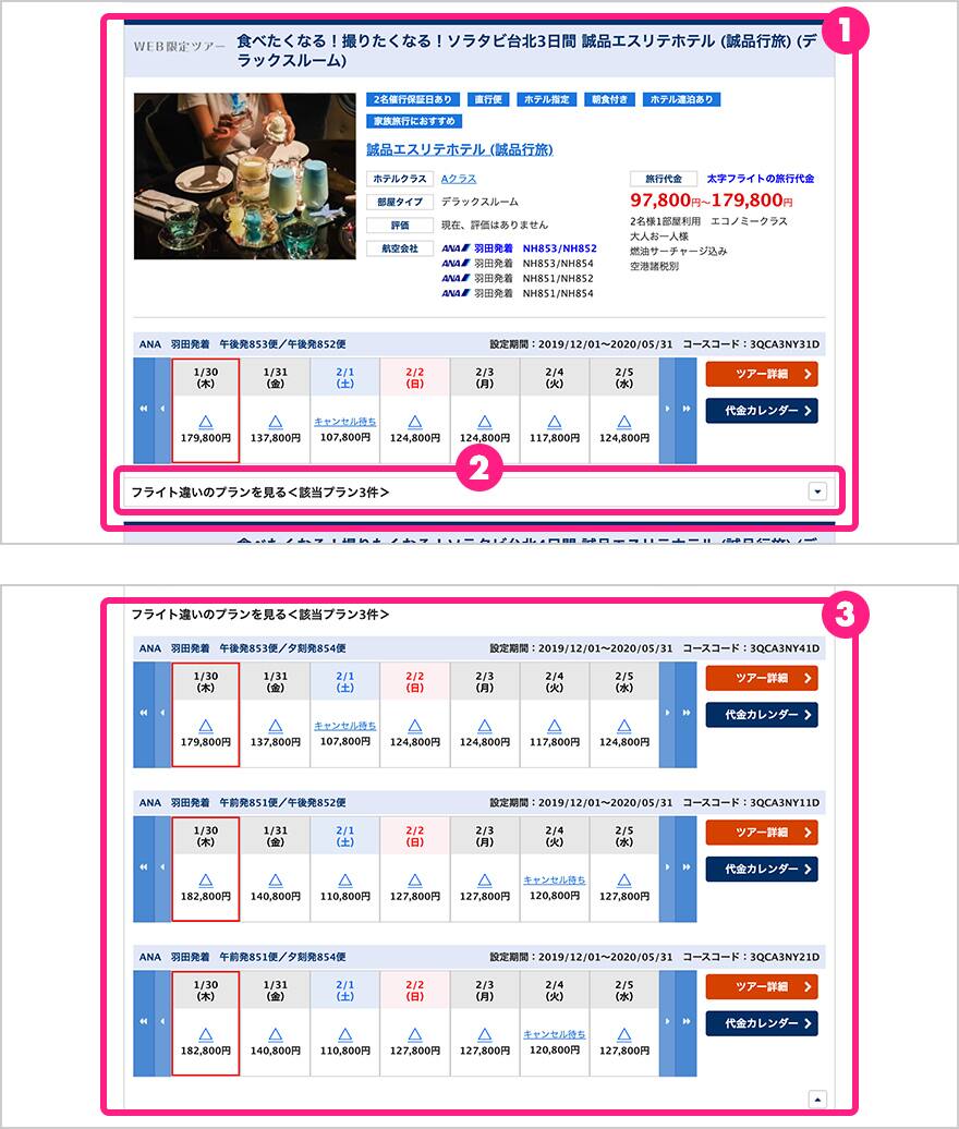 自分好みのホテル部屋カテゴリーを決めたら、利用する飛行機(羽田/成田)を❷エリアでフライト違いのプランを開いて、ご希望便を選択。