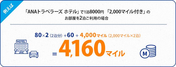 「ANAトラベラーズ ホテル プラスマイルプラン」で1泊13,000円(1,000マイル付き)のお部屋を2泊ご利用の場合、2,260マイル貯まります。