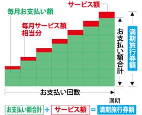 満期を迎えると、お客様のお支払い額合計にサービス額が加算され、満期旅行券額となります。