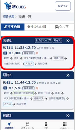 経路一覧からリムジンバスを使用する経路を選択し、経路詳細に進みます。