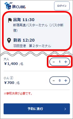 ご乗車区間をご確認のうえ人数を選択し、「予約に進む」ボタンをクリックします。