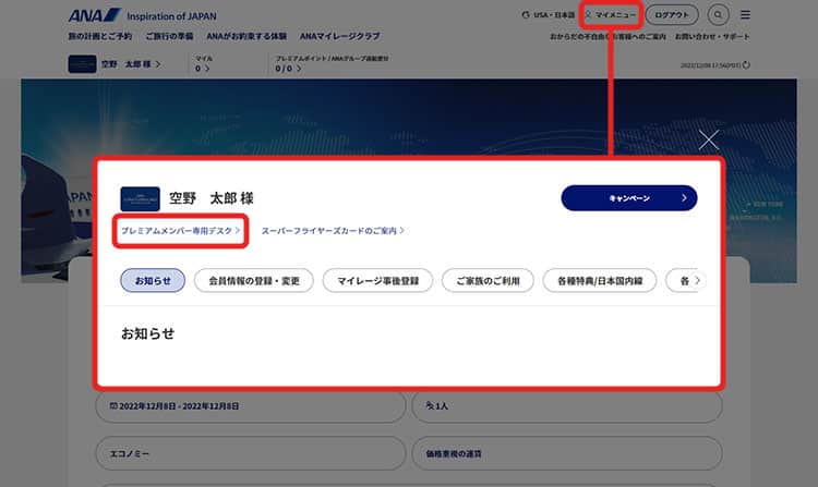 ANAウェブサイトにログイン後、マイメニューより「プレミアムメンバー専用デスク」をご覧ください。