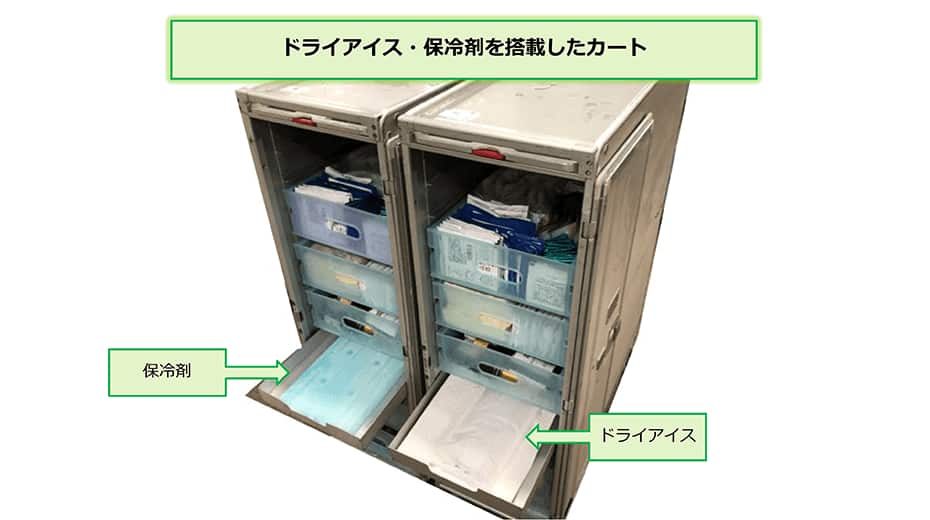 ANAグループでは、お客様に提供するお食事や飲み物の品質管理のための保冷にドライアイスを使用してきました。ドライアイスは保冷能力が非常に高く、使い捨てで運用が簡単な半面、昇華によるCO2排出や、コストがかさんでしまうという課題がありました。また、-78.5℃と非常に低温なため、取り扱いにも十分な注意が必要でした。