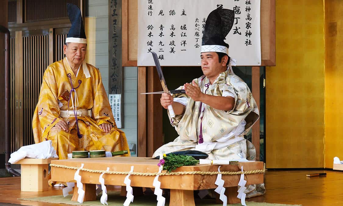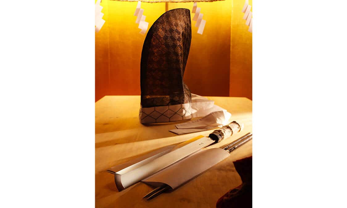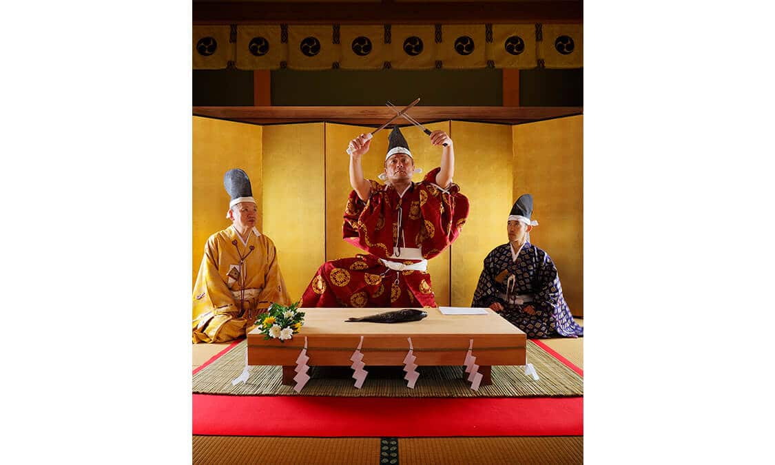 庖丁式は平安時代初期から宮中行事の一つとして行われていました。厳粛な雰囲気の中、当時の衣装をまとい、右手に式庖丁、左手に真魚(まな)箸を持ち、古式に則った無駄のない所作と熟練の技をあわせながら、一切手を触れることなく食材を調理します。一つ一つの所作や切形にも祝賀や祈願などの意味が込められています。庖丁式は、日本料理の伝統と精神を今に伝える儀式で、毎年5月17日、10月17日、11月23日に高家神社境内で庖丁式の奉納が執り行われています。
