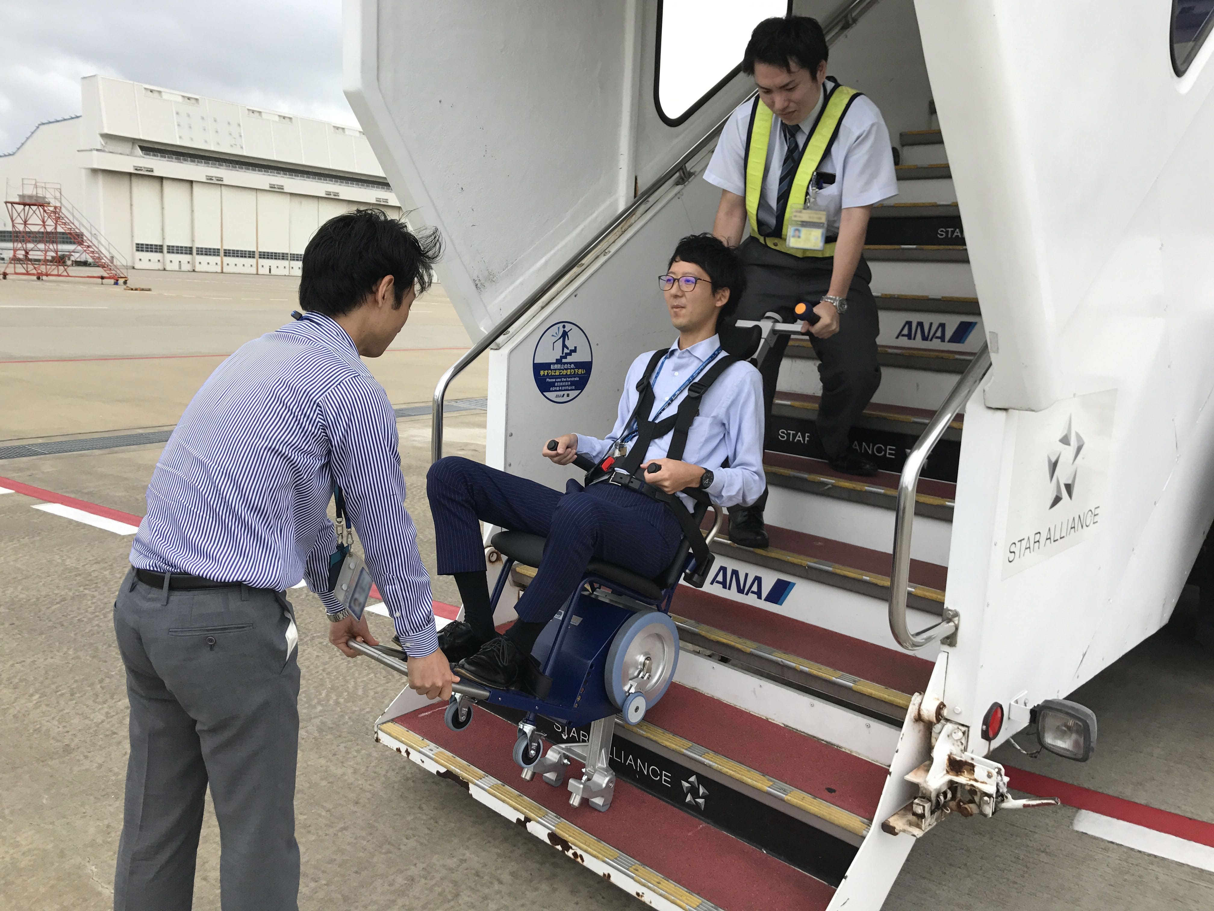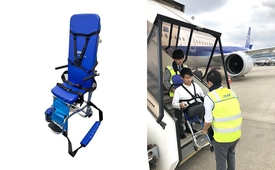 お座りいただいたままタラップを昇降し、機内座席までご案内いたします。