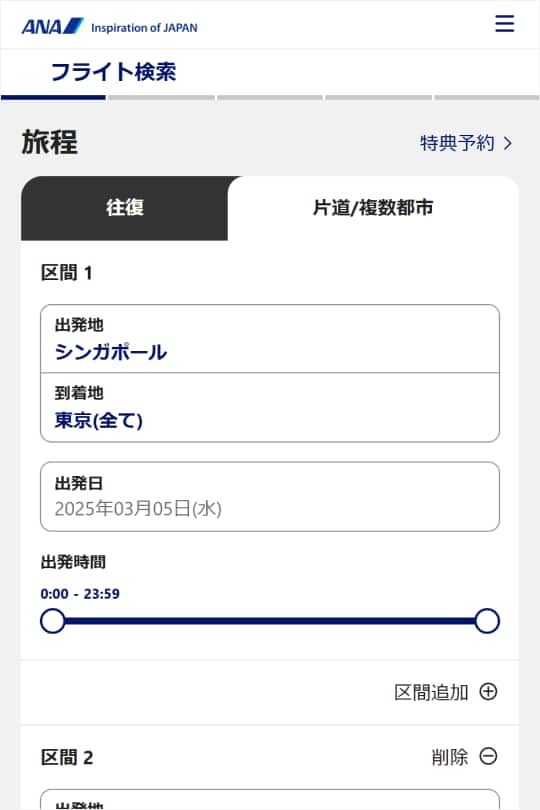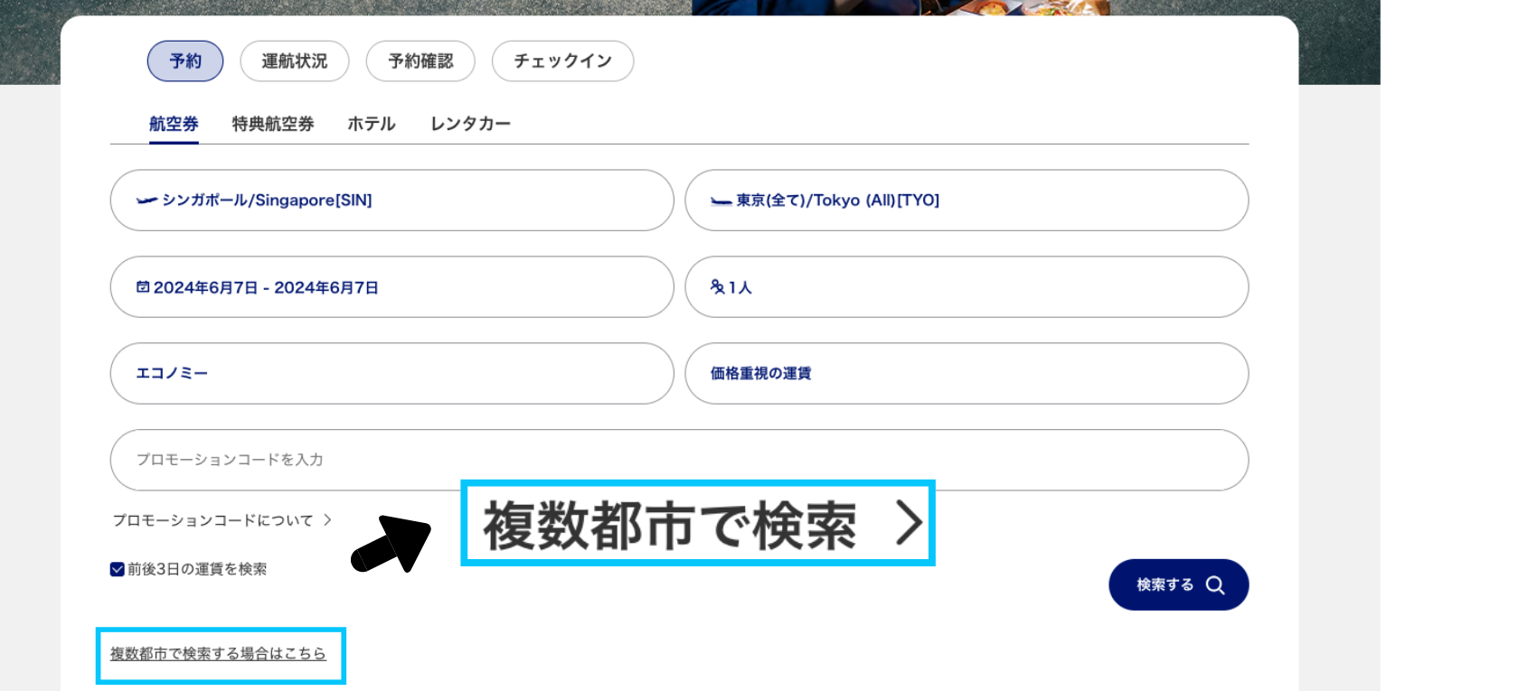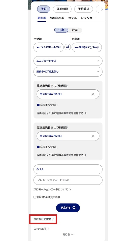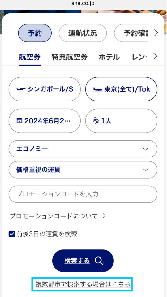 1. ANAウェブサイト内「複数都市で検索」をクリック