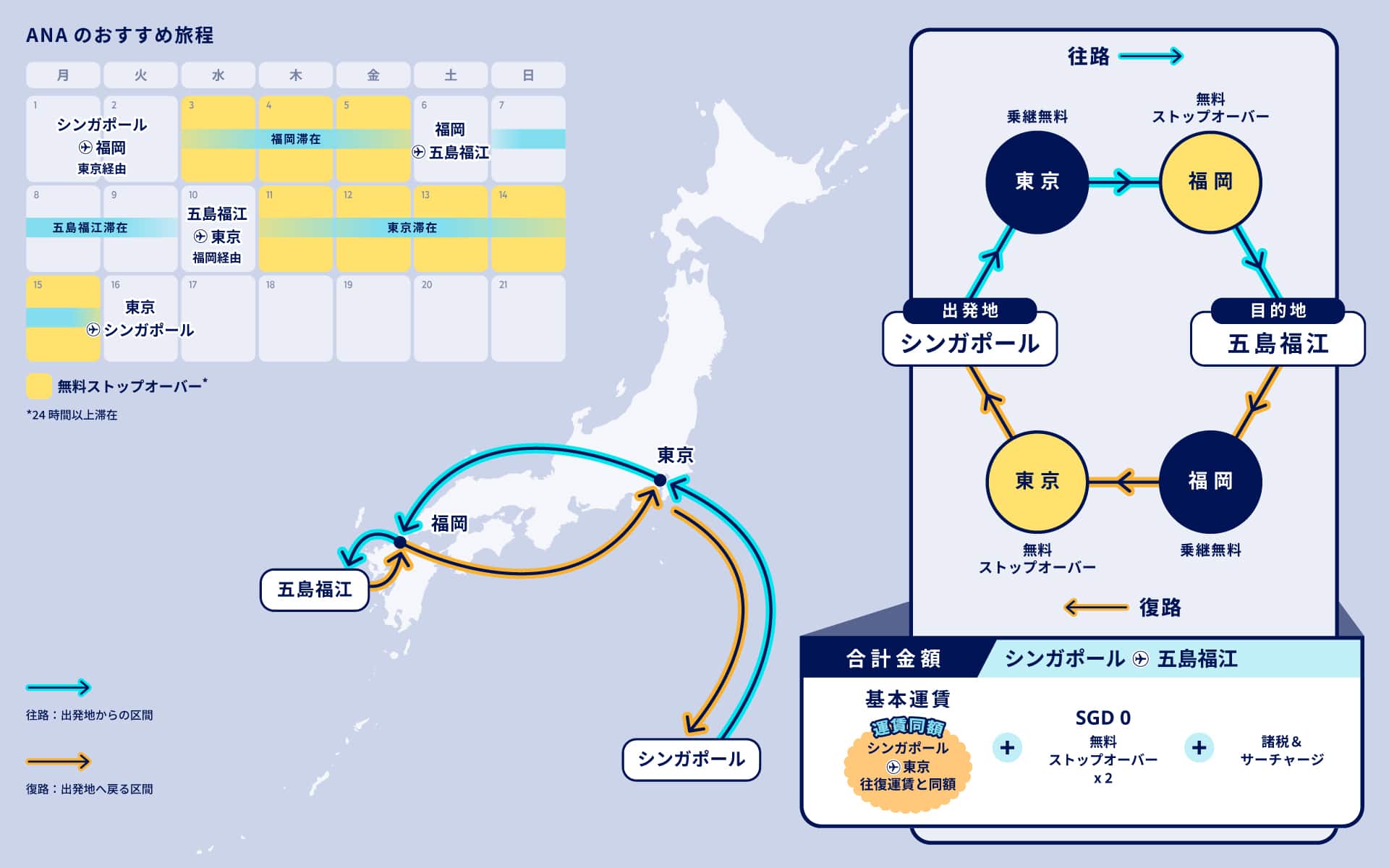 ANAならストップオーバー*が往路・復路でそれぞれ最大2回まで可能です(それぞれ1回目は無料、2回目は追加料金 SGD 130)。