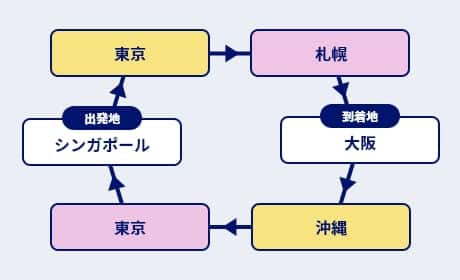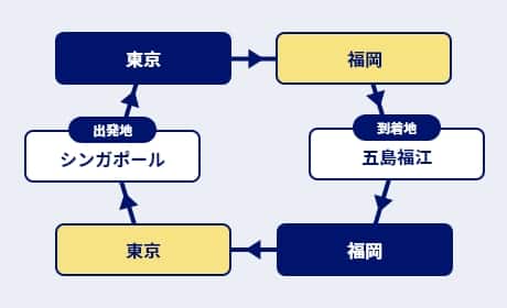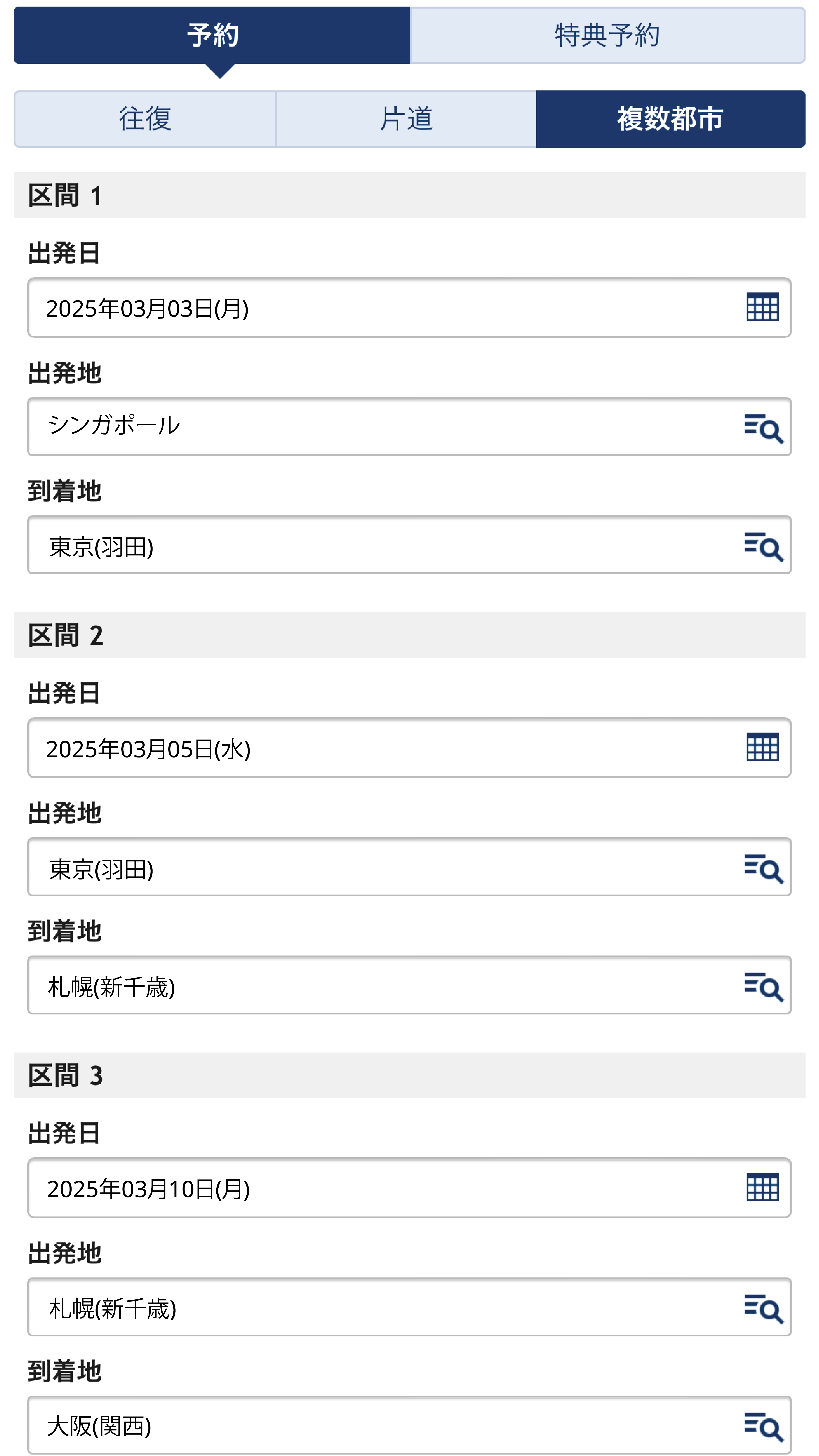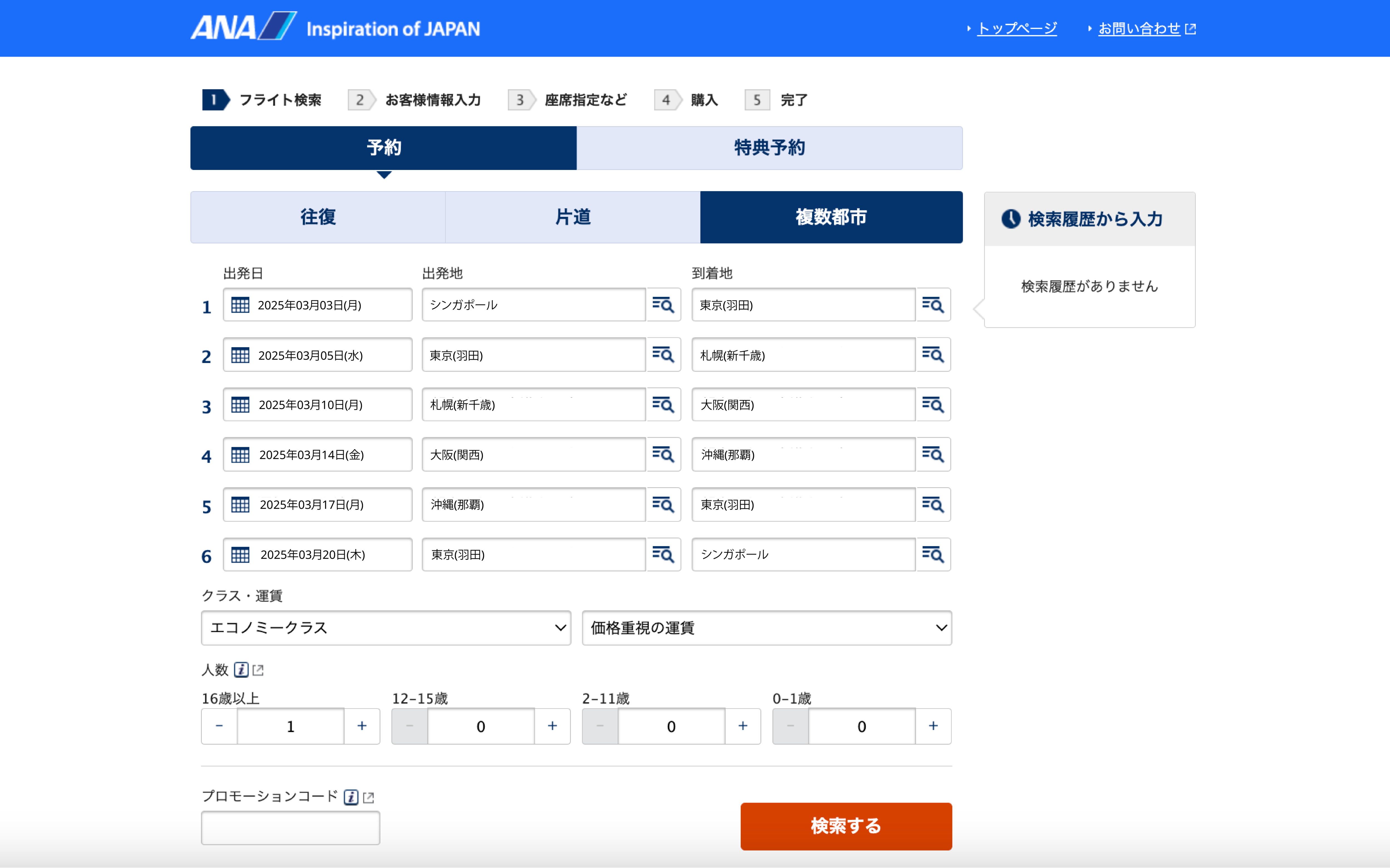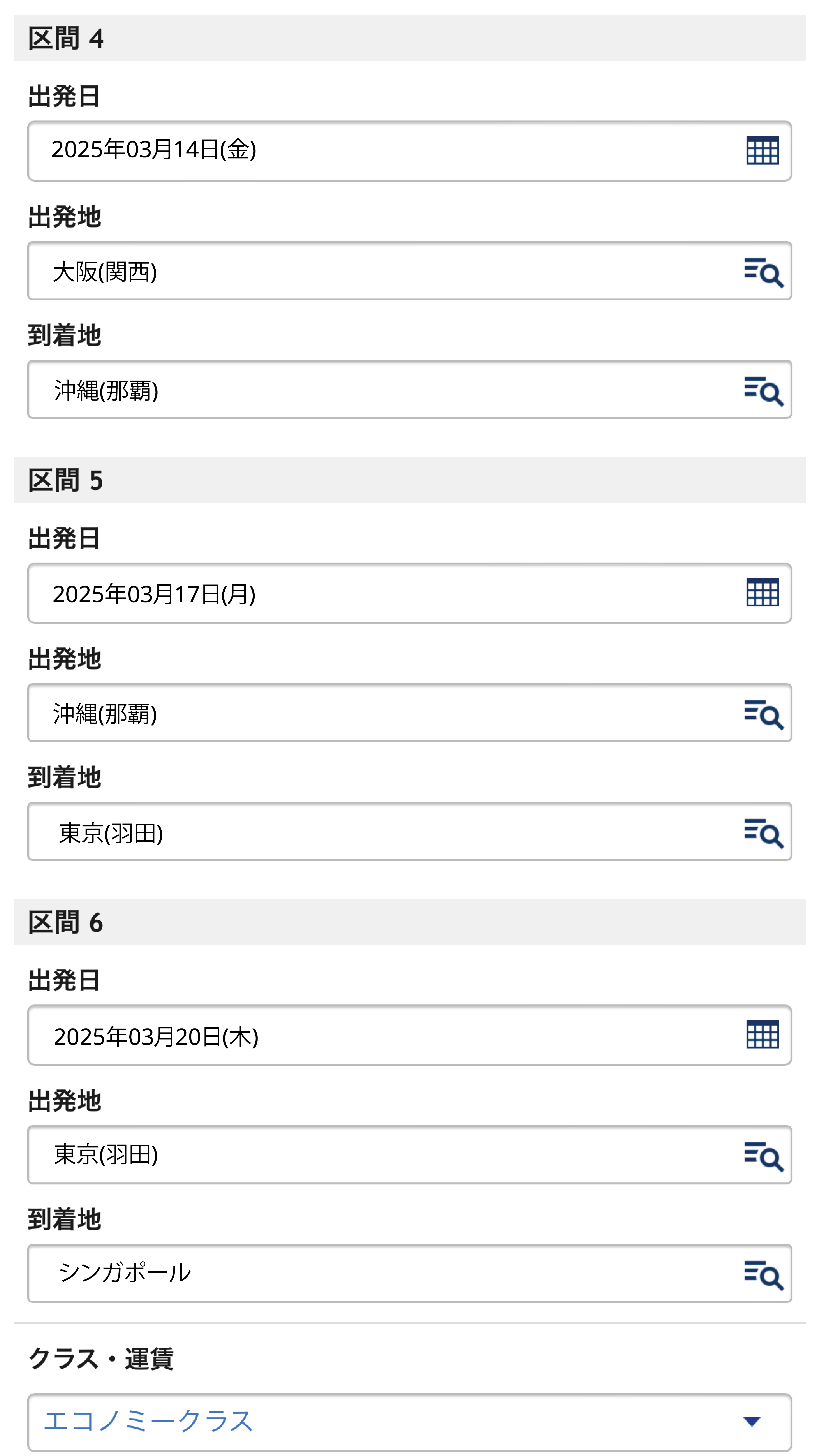 2. 区間毎に出発日、出発地(最初の出発地は日本国外であること)、到着地(最後の到着地は日本国外であること)を入力し「検索する」をクリック