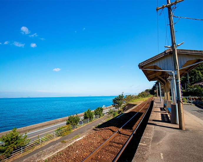 カラフルな花模様の「お結び玉」が恋愛成就のアイテムとして人気な圓満寺や、映画やドラマに使用されるほど素晴らしい景色が見られる下灘駅など訪れたいスポットがたくさん。のどが乾いたら蛇口をひねって、みかんジュースを召し上がれ(松山空港)。