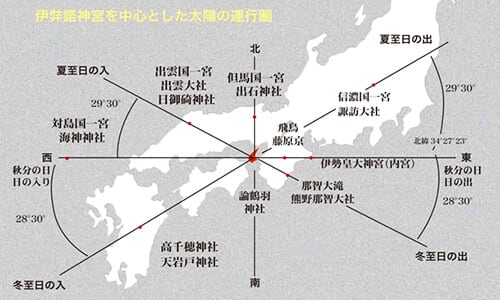 伊弉諾神宮を中心とする太陽の運行と有名神社の関係を現わす円形のモニュメントで、真東に伊勢(皇大神宮・内宮)、真西に海神神社(対馬)、真南に諭鶴羽(ゆづるは)神社(淡路島)、真北に出石(いずし)神社(但馬)、夏至の日出に諏訪大社(諏訪湖)、日没地に出雲大社・日御碕神社、冬至の日出に熊野那智大社(那智御瀧)、日没地の高千穂神社(宮崎県)が鎮座するなどの古代ロマンに思いを馳せることができます。