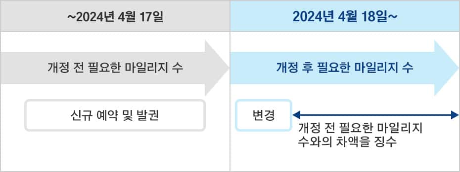 개정 전 필요한 마일리지 수 그대로 여정 변경을 접수합니다.