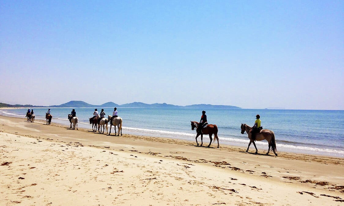2017년에 오픈한 해변의 글램핑 리조트 '글램핑 후쿠오카'는 빈손으로 캠프를 즐길 수 있는 럭셔리 캠프 시설. 글랭핑이란 '글래머러스×캠핑'의 약칭으로 대자연 속에 있으면서 호텔 수준의 호화롭고 쾌적한 서비스를 받을 수 있는 완전히 새로운 캠프의 형태입니다. 겐카이나다를 바라보면서 '해변 승마 체험'과 현지에서 잡힌 어패류를 사용한 초밥 만들기 방법을 알려 주는 '겐카이나다 초밥 학교' 등 액티비티도 풍부합니다.