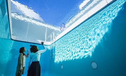 가나자와 21세기 미술관을 대표하는 작품! '레안드로의 수영장'은 전람회 존과 무료로 입장할 수 있는 교류 존 두 곳 모두에서 볼 수 있습니다. 그 즐거움 중 하나가 바로 수면을 사이에 두고 다른 사람과 만나는 것입니다. 위에서 내려다보는 사람과 아래에서 올려다보는 사람. 수영장을 내려다보다가 물 속에 있는 사람을 발견했을 때의 놀라움, 내부에서 물 위를 올려다보는 즐거움. 다양한 경험이 펼쳐지는 이 작품은 당연시되는 일상의 감각을 뒤흔들며 지상과 지하(수영장 내부)에서 사람들 사이의 만남을 만들어 냅니다.