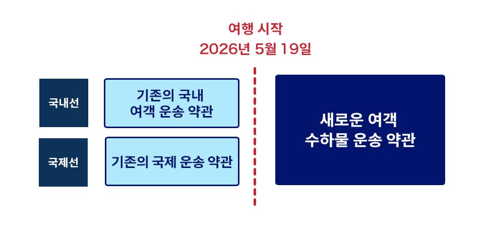 국제선 이용 시, 2026년 5월 18일까지 여행을 개시하신 경우에는 2026년 5월 19일 이후라도 여행 종료까지 기존의 국제 운송 약관이 적용됩니다.