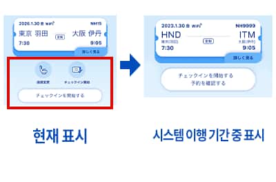 구 시스템 이용 공항에서의 출발 항공편은 출발 시간 24시간 전부터 ANA 앱 TOP 화면의 ‘좌석 변경’, ‘체크인 취소/변경’, ‘탑승권 발행’ 버튼 표시가 없어지며 ‘체크인 시작하기/예약 확인하기’ 버튼이 표시됩니다.