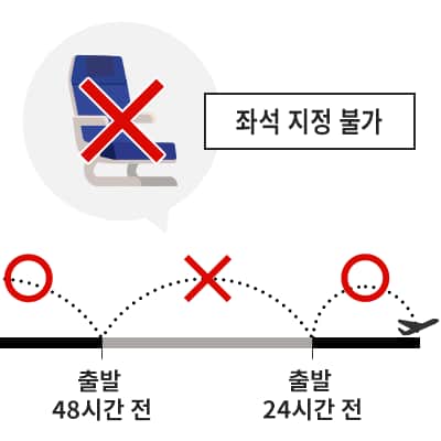 구 시스템 이용 공항에서 출발하는 예약 항공편의 경우, 출발 시간 48~24시간 전의 좌석 지정이 불가능합니다. 사전 좌석 지정이 가능한 운임인 경우에는 출발 시간 48시간보다 전에 좌석 지정 또는 온라인 체크인 및 카운터 수속 시에 좌석 지정이 필요합니다.