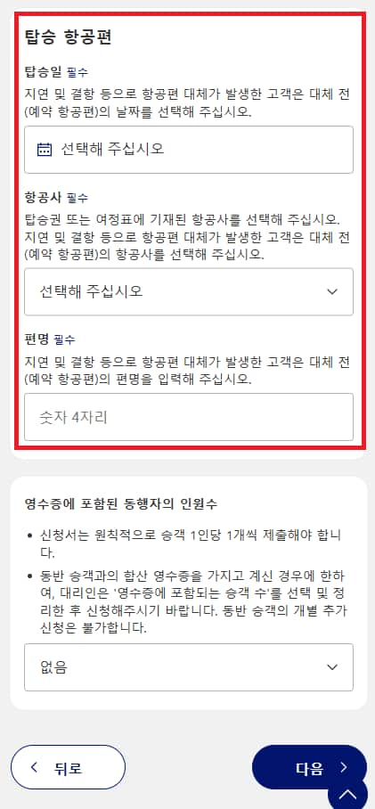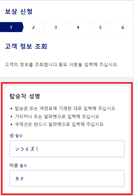 탑승자 성명은 탑승권에 기재된 대로 입력해 주십시오.
