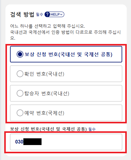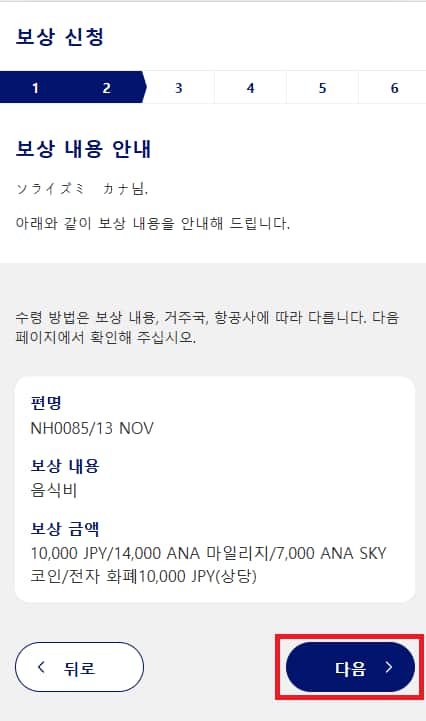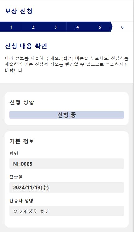 보상 재신청을 누르신 후 ‘보상 신청’의 STEP 3 이후에 따라 수속을 진행해 주십시오.