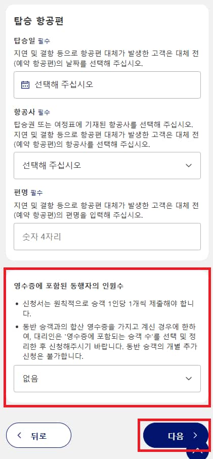 여러 명이 숙박비, 교통비 등의 대납 비용을 사후 정산하시는 경우에만 ‘동반자 인원’을 입력해 주십시오. 여러 명이 신청할 때의 에러에 대해서는 ‘자주 묻는 질문’에서 확인해 주십시오.