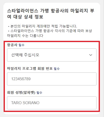 희망하시는 항공사의 마일리지 회원 번호를 입력해 주십시오.