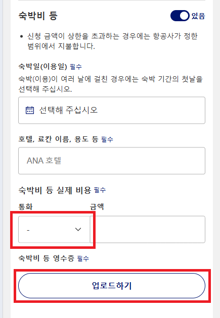 영수증 업로드 화면은 숙박비 및 교통비 등의 대납 정산 시에만 표시됩니다. 영수증을 준비하신 후 필요한 정보를 입력해 주십시오.