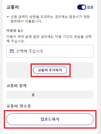 영수증 업로드 화면은 숙박비 및 교통비 등의 대납 정산 시에만 표시됩니다. 교통비가 있는 경우에는 ‘교통비 추가’를 누르신 후 필요한 정보를 입력해 주십시오.