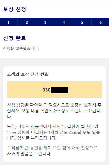 신청이 완료되었습니다. 보상 신청 번호는 문의 시 등에 확인하므로 잘 보관해 두십시오.