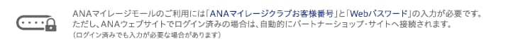 本サービスは、ANAマイレージクラブ日本地区会員を対象とします。 お客様が「ANAマイレージモール」サイトを通して行う「商品購入・サービスのご利用」は、すべてお客様と「ANAマイレージモール(提携企業)」との間で行っていただくものです。万一「ANAマイレージモール(提携企業)」との間に生じた商品購入・サービス利用に関するトラブル・損害については、当社は一切責任を負いません。