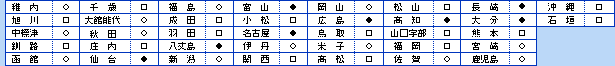 ●は手荷物検査場の内側(手荷物検査場の内側に入るには、チェックイン済みの航空券が必要)です。 ○は手荷物検査場の外側にあります。□は手荷物検査場の内側・外側両方に店舗がございます。 ※詳しくは各空港にてご確認ください。※新潟空港は空港売店「アカシア」になります。 |