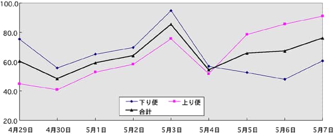 | * | 期間中のピーク日は下り便が5月3日(水)、4月29日(土)、上り便が5月7日(日)、6日(土)、5日(金)となりました。 | ||