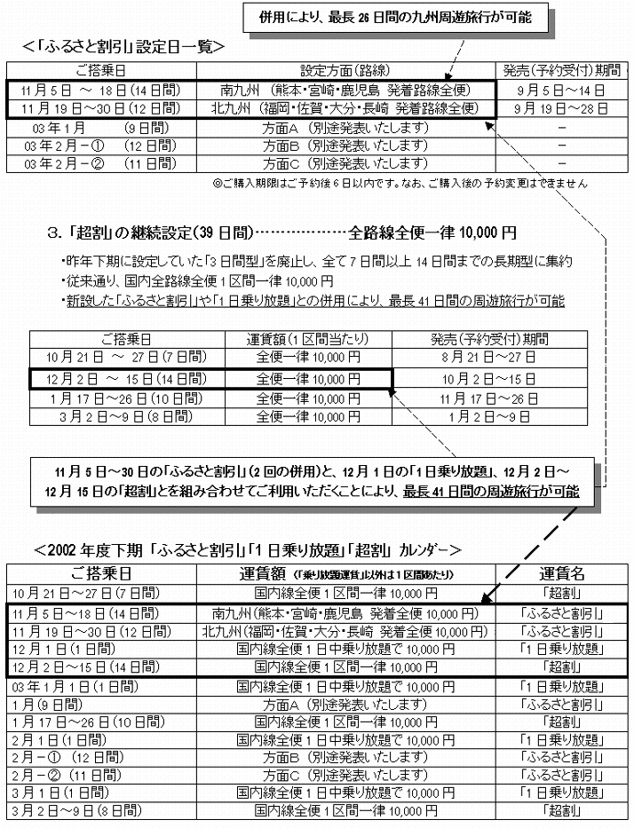 2.「ふるさと割引」運賃の新設(58日間)………………10,000円 ・ご搭乗期間と方面(路線)限定で、当該方面の該当空港発着全便が1区間10,000円 ・ご自分のふるさとをゆっくりお訪ねいただくのに最適な運賃。 ・期間中、郷土色豊かなサービスもご提供していく予定 ・期間をまたがってご利用になれば、20日間以上の長期周遊旅行が可能 ・ANA・エアーニッポン*全便が対象 ・2003年度上期までに日本全国の全方面を一巡する予定