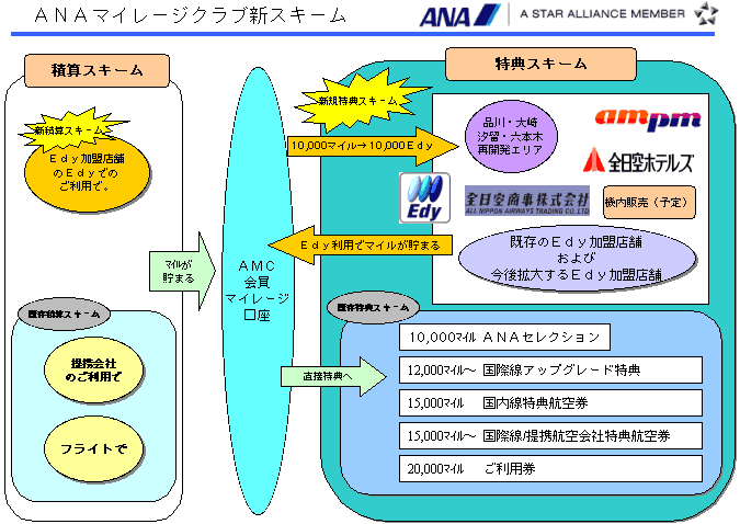 ANAでは、6月1日(予定)より、世界で初めて、貯めたマイルを電子マネーに変換するサービスを開始致します。これにより、マイルから変換された電子マネーをチャージしたANAマイレージクラブ(会員数約900万人、以下AMC)カードを、お買い物の際にレジにかざすだけでお支払いを済ませることができます。 ANAグループが新たに発行する「AMC Edyカード*」には、ソニー株式会社(本社:品川区、社長:安藤国威)が開発した非接触ICカード技術「FeliCa(フェリカ)」を採用しており、電子マネー機能が搭載されています。 これまでに貯められたマイルをお買い物のお支払いにご利用頂くには、あらかじめインターネットなどを通じて、ビットワレット株式会社(本社:品川区、社長:川合 成幸、ソニーグループ約42%出資)が展開するプリペイド型電子マネー「Edy(エディ)」にマイルを変換し、「AMC Edyカード」に「Edy(エディ)」をチャージすることが必要です。 |
