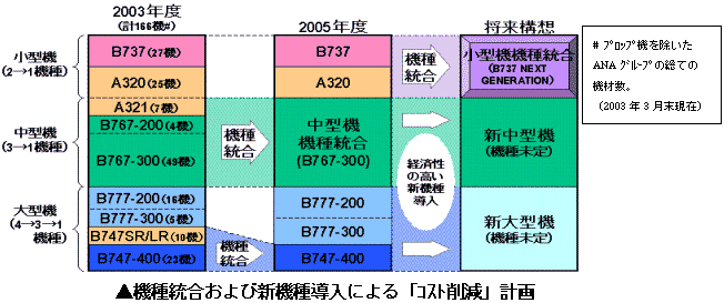 2.2005年度以降の機種統合および新機種導入による運航コスト削減計画を具体化! 2005年度以降はさらに小型機の機種統合を進め1機種とし、将来は中型機および大型機をより経済性の高い新機種に更新し、更なる運航コストの削減を図ります(下図参照)。 ANAグループでは、現在A320型機およびB737型機の計52機**の小型ジェット機を保有しておりますが、これらの機材更新に伴う新機種の導入について「新機種選定委員会」にて検討してまいりました。経済性や路線ネットワ-クとの適合性などの観点から総合的に検討を行った結果、新機種をボーイング社のB737-700を主とする「B737 NEXT-GENERATION」シリーズに決定いたしました。新機種に統合することにより、年間約60億円の運航コストの削減を見込んでおります。 |