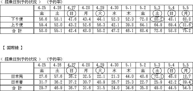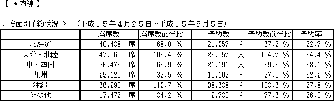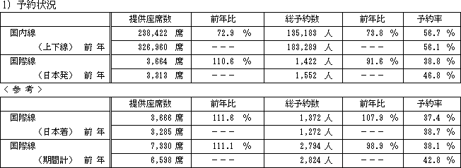 当該期間中の予約状況は、全線計で約13万5千人、前年比 73.8%で、提供座席数前年比を若干上回る伸びとなっています。 |