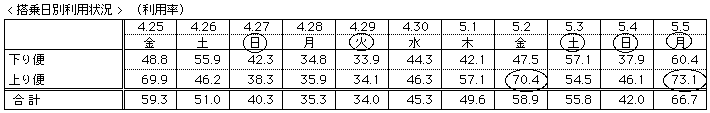 期間中のピークは、上下便共に5月5日(月)となっており、曜日配列から需要が後半に集中しました。