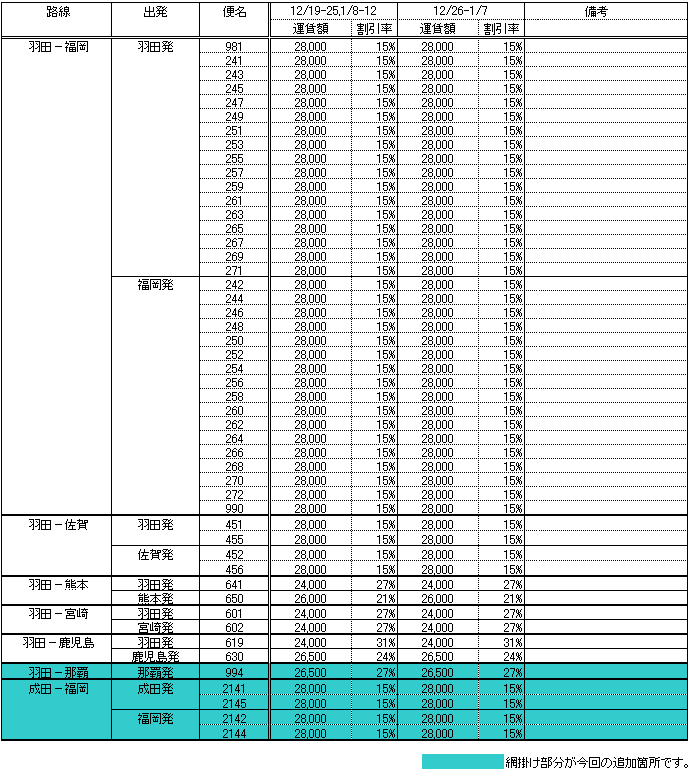 ■「特割7(セブン)」運賃(2003年12月19日〜2004年1月12日搭乗分)