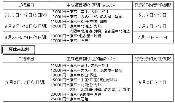 2003年度下期にリニューアルし、方面別の価格設定とした「超割」を7月〜9月も継続設定いたします。 7月〜9月の期間で、夏休みの8月2・3日「夏休み超割」を含む14日間でご利用いただけます。 |