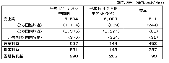 | ●本年度中間期は、国際線旅客が欧米路線を中心に好調に推移したことに加え、昨年SARSによる深刻な影響を受けていた中国路線の旅行需要についてもSARS以前の水準に回復するなど良好な状況で推移しました。しかし、費用面では、燃料の高騰が与える影響が今後の収益を圧迫する最大の要因となることから、現在のところ、年度後半の需要動向等含め、4月30日に発表しました業績予想の変更は予定しておりません。 ●国際線旅客において特に欧米路線の需要が極めて良好となり、上期の利用率は80%を超える水準となりました。中国路線もビジネス需要が堅調に推移し、夏場以降の観光需要もSARS以前の水準に回復した結果、旅客数は対前年同期比136.6%となり、244億円の増収となりました。 ●国内線旅客は収益向上を優先、需要に見合った適正な機材投入を行うためのシステムである「FAM(Fleet Assignment Model)」や需要動向に応じた適切な座席配分を設定し、収入を極大化させるシステムである「PROS(Passenger Revenue Optimization System)」を活用した結果、生産量(座席キロ)を対前年同期比95.3%、旅客数は対前年同期比98.7%となり、83億円の増収となりました。 ●貨物事業は、国際・国内線ともに活発な荷動きにより輸送量の好調な伸びが持続するとともに深夜貨物便や中国線貨物専用便も貢献し、国際で17億円、国内で18億円の増収となりました。 ●その他 |