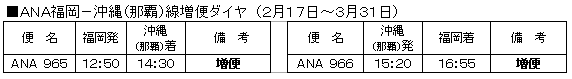 | 2005年2月17日(木)より、ご好評頂いているANAの福岡−沖縄線が、現行の1日7往復から1日8往復へと増便いたします。今まで以上に多くの方々に便利にご利用頂けるようになります。 |