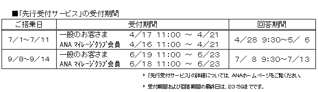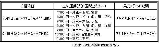 | ANAは、本日、7月および9月ご搭乗分の「超割」運賃を、国土交通省に届出いたしました。 7月および9月の「超割」は、お客様からのご好評にお応えして、昨年よりも日数を拡大し、合計18日間設定いたします。運賃額は路線毎に 7,300円〜17,300円でご利用いただけます。 ANAでは、ホームページにて「超割」発売前にご希望便をうかがい、発売開始後に予約の可否をお知らせする『先行受付サービス』を実施しております。また、「超割」にあわせた『ワン・モア・ホテル・バーゲン、ワン・モア・レンタカー・バーゲン』のお得なサービスもご用意しておりますので、これらもご活用いただき、ぜひご旅行にお出かけください。 設定概要は次のとおりです。 |