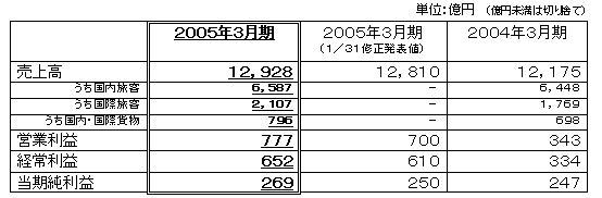 2005年3月期は、一進一退の景気動向や燃油費の高騰、度重なる台風の影響など、外部環境面で厳しい1年となりました。しかしながら、人件費の削減や機材の需給適合による運航コストの抑制など、総額300億円の費用削減を当初計画よりも1年前倒しで行ったことに加え、国際線需要が堅調なことや国内線の単価が改善したことから、売上高、経常利益両方で、過去最高数値を記録いたしました。 |