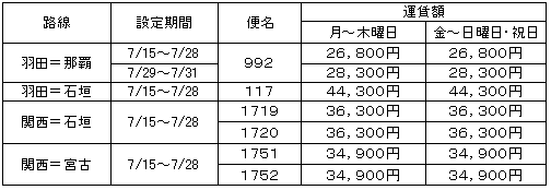 | ◆ 対象路線 : 羽田=那覇、石垣、 関西=石垣、宮古 ◆ 設定内容 : |