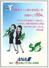 ANAグループでは、来る6月14日(火)、ANAグループの客室乗務員や各地の地上スタッフが、全国33地区の赤十字病院をはじめとした52ヶ所の病院に入院されている患者の皆様に北海道の「すずらん」を『押し花』のしおりにして、お届けにまいります。 これは、入院されている方の1日も早いご回復と病院関係者の慰労を兼ね、昭和31年から続けているANAグループの社会貢献活動であり、「しあわせ」・「幸福の訪れ」・「しあわせの再来」などの花言葉を持つ白く可憐な花「すずらん」は、患者の皆様方から「北海道からの心を癒す贈り物」と毎年ご好評をいただいております。 記念すべき50回目となる今年は、「しあわせの花 すずらん」が