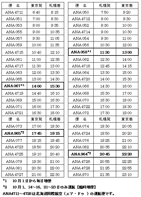 | 1.東京(羽田)=札幌(新千歳)線を増便 羽田=札幌(新千歳)線を、1日最大2往復増便し、合計で1日あたり最大24往復(エア・ドゥ運航便8往復含む)とします。 |