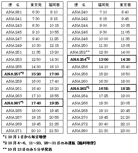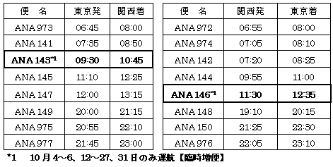 | 2.東京(羽田)=大阪(関西)線を増便 東京(羽田)=大阪(関西)線を、10月中、20日間で1日1往復増便し、合計で1日あたり最大8往復とします。 |