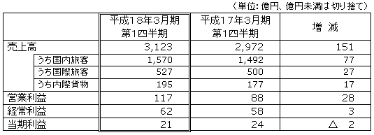 前期は、機材関連報奨額を営業外収益として計上していましたが、今期より取りやめたことなどにより、経常利益は、前年同期比で約3億円の増益に留まりました。また、特別損失として、固定資産売却損を計上しており、当期利益ベースでは、前年同期比で約2億円の減益となっております。 なお、平成18年3月期の連結業績予想は、期初予想を据え置いております。 |